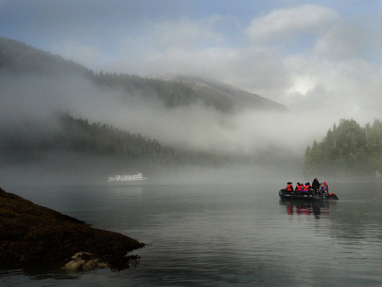 There followed our descent in a section of canal that contains the only surviving manually-operated road bridge at Moy, where the operator gave us a friendly wave. Crossing Loch Lochy we had a couple of presentations on history and photography respectively, before beginning our descent of Neptune’s Staircase, a flight of eight locks in succession, each one lowering the vessel by eight feet, until we arrived close to sea level at the Corpach Basin with just the sea lock on the canal’s Atlantic side ahead of us. Beside us the impressive bulk of Ben Nevis, often shrouded in mist but with today’s crystal-clear visibility it was possible to see the gentle southern path to the summit as well as the brooding northern rock-faces, the latter attracting ice-climbers to the area in the winter months making this an all-year destination for mountaineers.