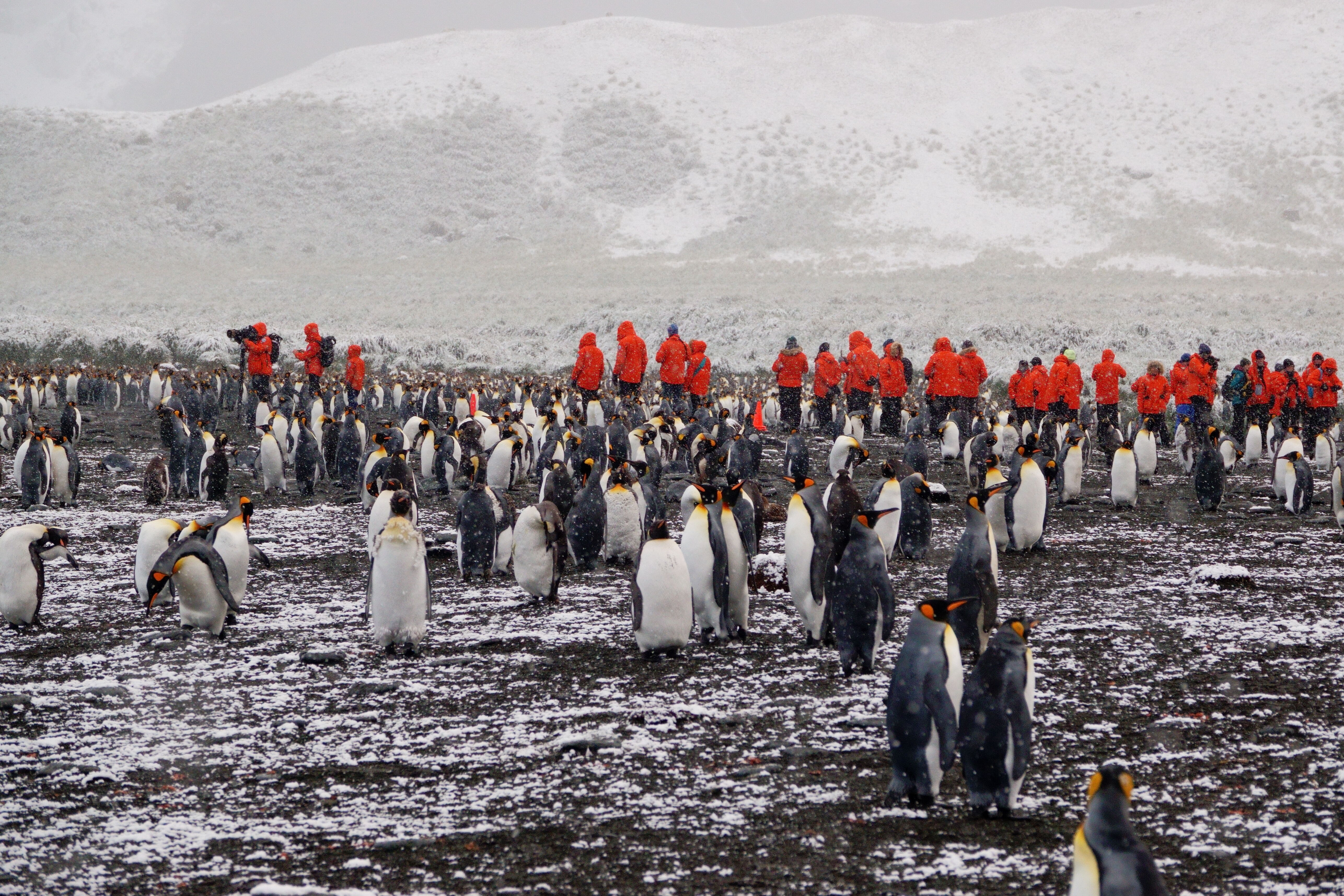 In our typical tradition, we began operations at Gold Harbour just as dawn was breaking over a stunning bight in the South Georgia shoreline. Snow showers and low clouds cast a dramatic atmosphere over this bustling shoreline, where over 30,000 pairs of king penguins and thousands of elephant and Antarctic fur seals gather to breed each year. It made for a thrilling start to the day. We spent the entire morning here, arranging an after-breakfast landing and hike for those who chose not to join us in the wee hours of the morning. With a marked improvement in the weather, the second morning landing truly made for a complete experience here. Hikers set out to explore the plateau that rises over the beaches and colony, while the rest of the guests took in the awe-inspiring sights and sounds of the third largest king penguin colony on South Georgia Island.