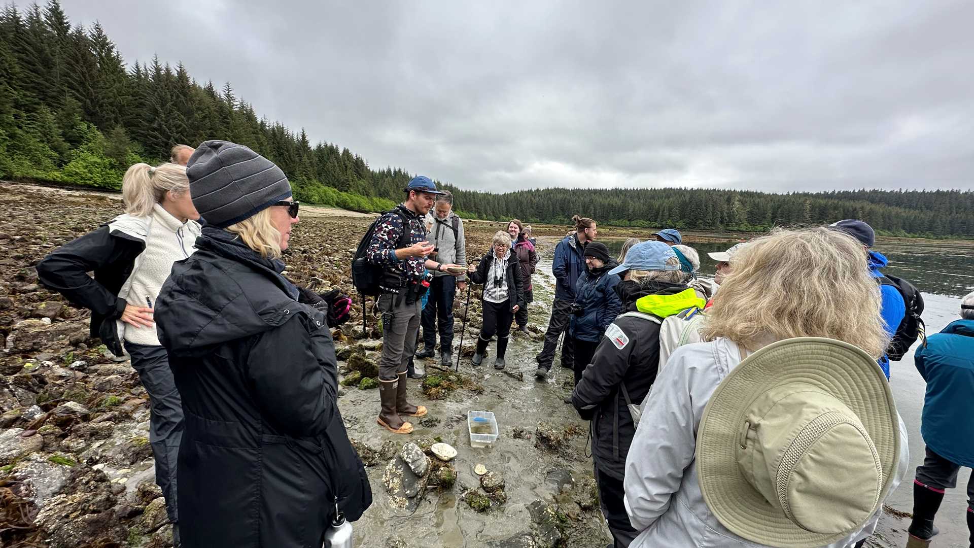 Today’s expedition began with National Geographic Venture cruising into Halleck Harbor on Kuiu Island. Guests were offered chances to hike along the rugged coast or kayak to explore the intertidal zone, which is perfectly exposed due to the extremely low tides often found in Southeast Alaska. Hikers in the temperate rainforest discussed the components of forest succession, and the intertidal groups explored the exposed rocks to find sea stars, small fish, and crabs. In the afternoon, the ship ventured north through Chatham Strait, coming across sea otters, humpback whales, and a variety of bird life on an unusually sunny Alaska afternoon.