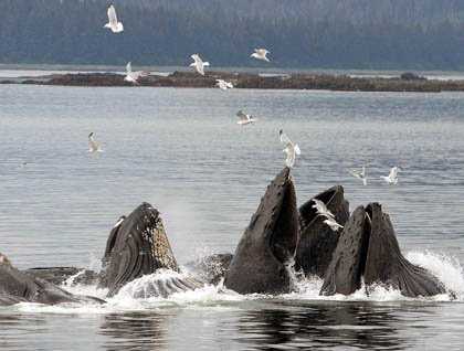 Later in the afternoon, National Geographic Sea Bird cruised past forested Sitka spruce and western hemlock shorelines in search of humpback whales cooperatively feasting in groups, called bubblenet feeding. We stayed for hours observing the unique feeding behavioral habits of these cetaceans. It was suspenseful listening to their wide ranging, high-pitched screeches to then have them surprise us, each time anew, as they surged to the surface to consume herring. It was a day found only in Southeast Alaska!