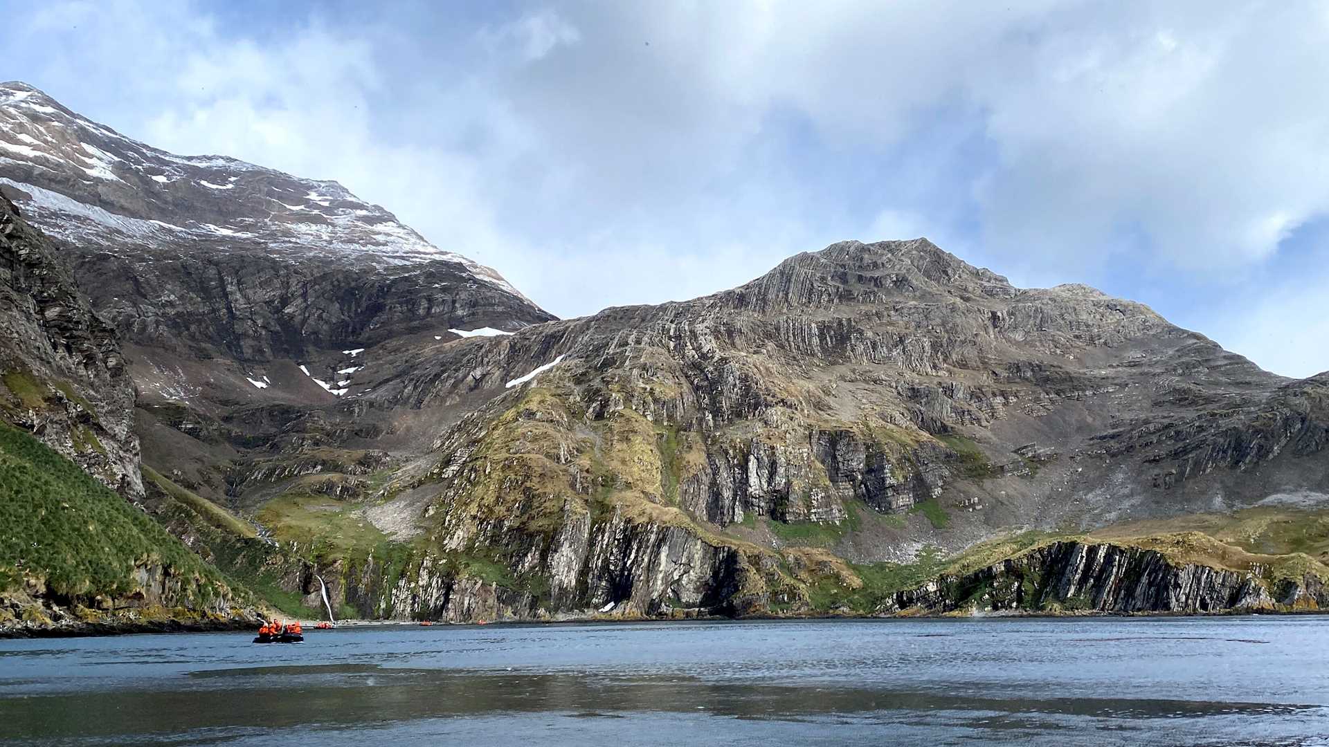 After yesterday’s windy start to our South Georgia visit, it was delightful to awaken this morning to calm conditions in Hercules Bay. Exploring by Zodiac, we found riches of avian and pinniped wildlife, lush vegetation, and swirling kelp forests. Macaroni penguins clambered down steep hillsides from their tussock burrows to the sea. Light-mantled albatross soared overhead, and playful young fur seals filled the intertidal zone. Strikingly folded sedimentary rocks created a dramatic landscape.