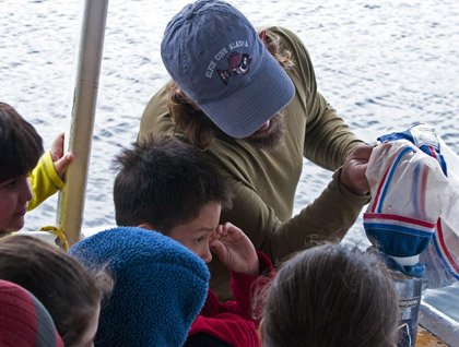 Before breakfast, we reached loose pack ice and an announcement was made informing everyone of walruses sighted on an ice floe. That was a great start in the morning, but before long we had our first polar bear of the day…then another…and another. Conditions could not have been better with partly cloudy skies, glass-smooth water with beautiful reflections, brilliant ice floes, and bears! Lots of bears. At one point in time, we could see nine bears scattered about, including a mother and cub, two swimming bears, and one on a seal kill. It would be hard to imagine the number of digital images produced this day. Every time we pulled away from a bear, we soon sighted another one doing something equally interesting. It was astounding to have two separate bears both approach the ship on ice floes one right after the other in mid-morning. Another one actually slid into the water off its floe and swam over to investigate the ship. Everyone found his or her favorite spot on the ship from which to sight and photograph bears…many were on the foredeck, some liked the outside vantage from in front of the chart room (just below the bridge), quite a few were in the bridge itself, and a bunch of us went for the higher view from the sundeck (right above the bridge).
