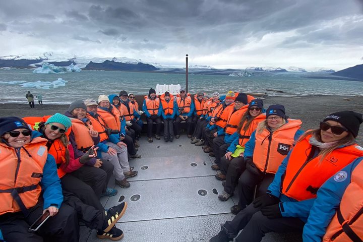 We enjoyed a packed day today, beginning with a tour of the natural wonders around Lake Myvatn in northern Iceland and ending with a visit to the Arctic Circle. In the morning, we toured the striking geological attractions of the region with stops at a magnificent waterfall, an eerie lava maze, and a pungent and colorful thermal field. After a lunch with a view from the recently constructed Foss Hotel, overlooking Lake Myvatn, we climbed to the top of a volcanic ash crater. After a spectacular dinner on board, and under the light of a midnight sun, National Geographic Explorer visited the island of Grimsey, which touches the Arctic Circle.