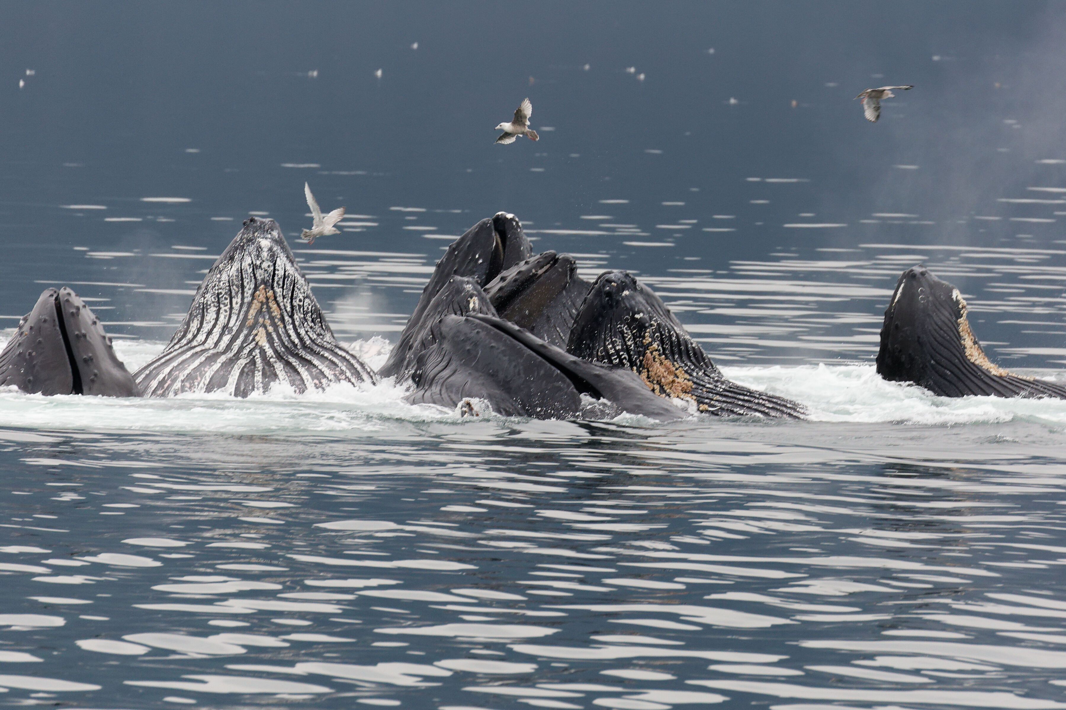 We spent the entire morning absolutely enthralled by nearly 20 separate bubble-netting events. During lunch we moved to a different area where we were treated to several whales lunge-feeding and an especially energetic calf who breached nearly continuously over a period of 30 to 40 minutes. Time after time it emerged from the sea like a rocket and fell onto its back, creating a huge spray of water. After several breaches the calf reluctantly heeded mom’s vigorous and loud lob-tailing call to return home, but even when home, it continued to breach. Indeed, the calf behaved as if it was having a zen-like experience, aware only of its inner self. Finally, mom and calf (who should have been near exhaustion at this point) slowly swam away.