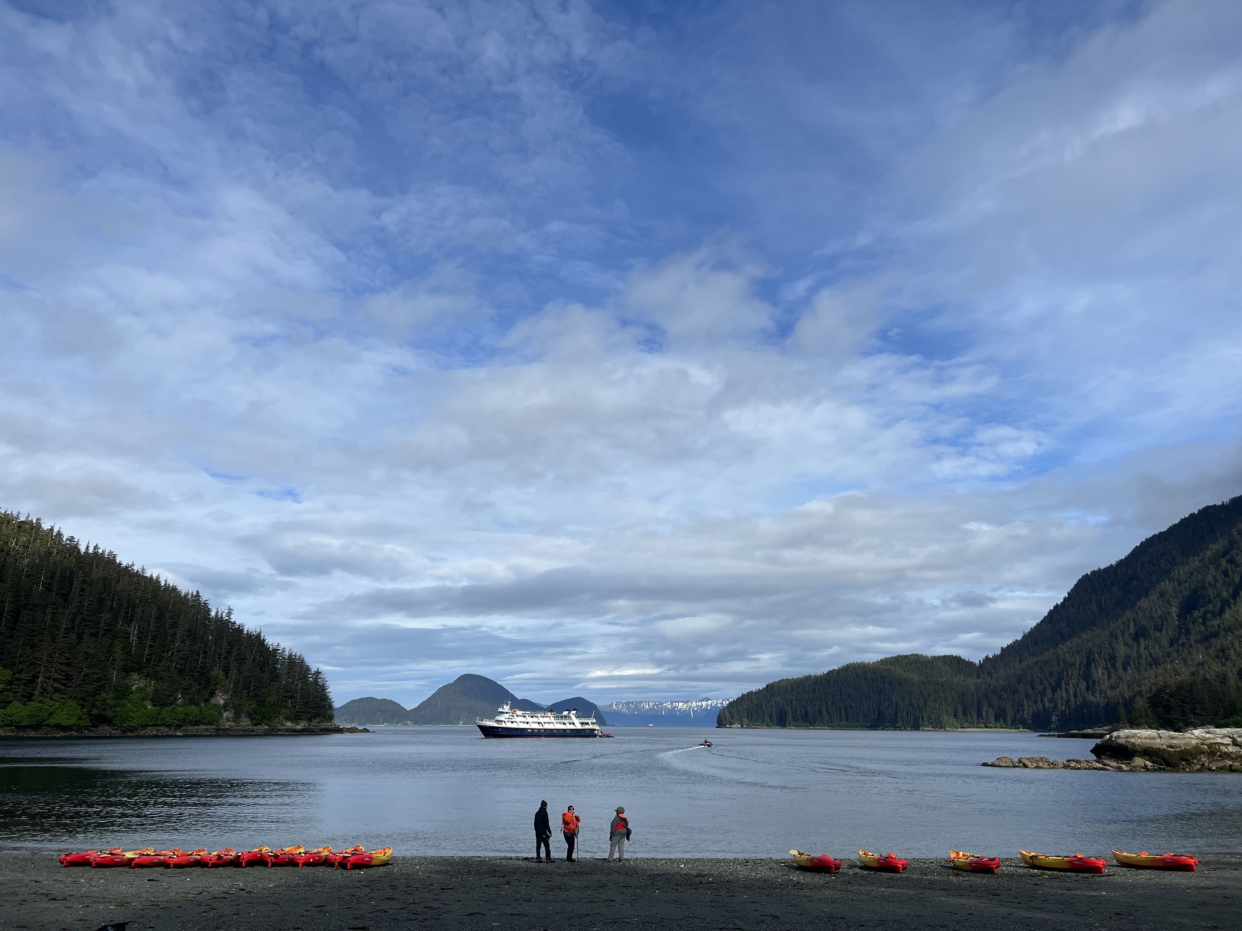Our afternoon at George Island proved just as phenomenal as our morning adventure. Guests chose between casual and moderate walks on George Island, where they learned about and saw a historic World War II installation site, complete with a six-inch 50 caliber gun waiting at one of the best lookouts in Southeast Alaska. Across Icy Strait, the Fairweathers graced us with their beauty. Brady Glacier flowed down from the mountains, and we got a rare glimpse of northern resident orcas cruising and spyhopping through the turquoise blue waters of the strait. On the diorite pebble landing beach of George Island, guests enjoyed kayaking amongst the kelp beds. Some even took a brisk dip in the icy waters before heading back to National Geographic Quest for cocktails and, of course, more food! What a day…I’m wiped!