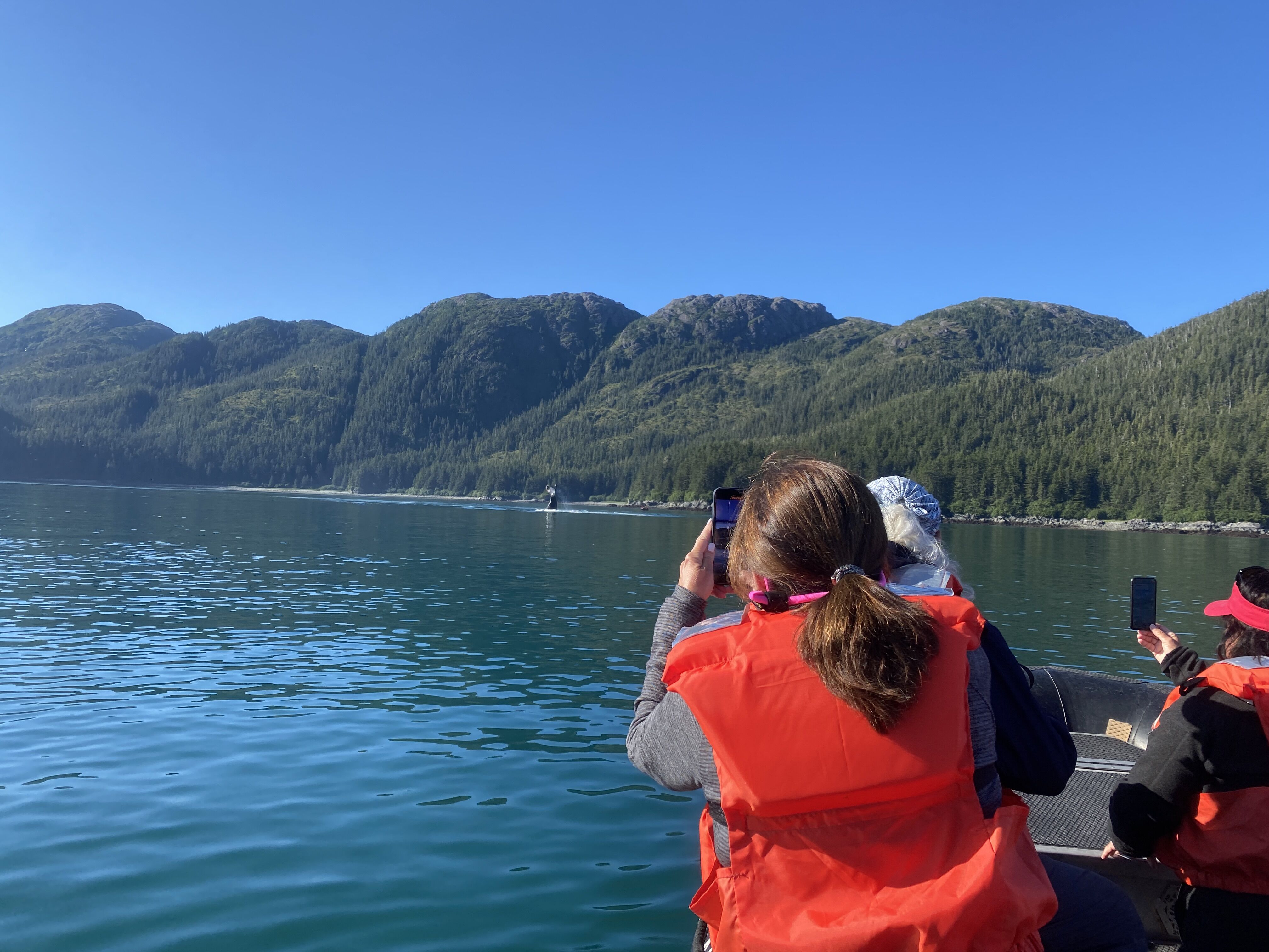 We spent the morning in the Inian Islands where the weather once again gave us a warm and beautiful cloudless day. The wildlife seemed ready to show off for us this morning. We were treated to breaching humpback whales, orcas, sea otters with pups, and resting harbor seals. Curious sea lions even took a break from their hunt and inspected the Zodiacs.