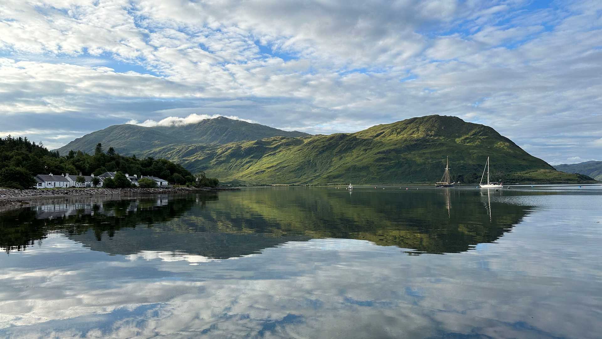 Shipboard mornings have a special quality that are hard to match unless one lives along a shore. This morning, we awoke in Loch Nevis, the heavenly loch. Calm, clear seas reflected verdant hillsides and the pristine white abodes of the residents of isolated Inverie. Although we sat in shadow, the sun poured its light down the U-shaped valley, alighting on the opposite shore. Gulls foraged in the intertidal zone where golden kelp was exposed to the elements, awaiting the return of the salty sea. Above, the sky was an intricate pattern of pastels, blue and grey. As the sun inched toward us, two brave souls from Tennessee and an encouraging expedition leader braved the frigid waters where the pulsating bells of jellyfish drifted, their food-accumulating tentacles spread like the rays of the sun.