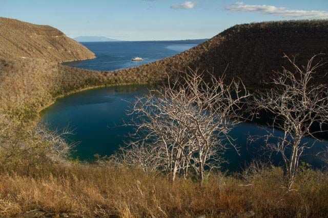 Relatively small and low compared to neighboring Santa Cruz, North Seymour is located to the north of Baltra. The island is dry with predominantly low shrubs, like prickly pear cacti. The incense trees are bare during the dry season. Seabirds like frigatebirds and blue-footed boobies nest on the island, and sea lions rest on the sand when they are not fishing. Land and marine iguanas also live here. Rabida is in the middle of the archipelago and has a striking red sand beach. We observed a small colony of sea lions of all ages resting or nursing. Behind the beach, American flamingos nest in a brackish lagoon. This island is full of contrasts and wildlife that we enjoyed observing during this day of expedition.