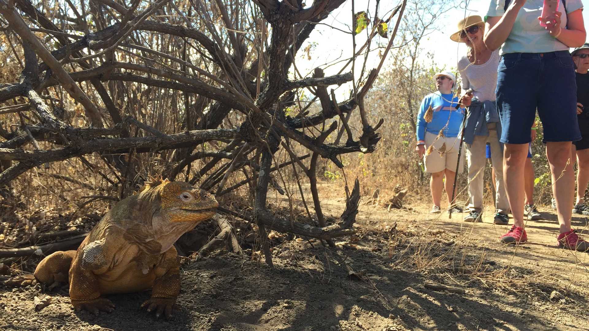 Today we visited the largest island of the Galapagos Archipelago covering 58% of the Galapagos Islands total land mass, Isabela Island. In the morning we visited Urbina Bay where we enjoyed walking along male yellow iguanas and contemplating 6km upwelling terrain that occurred in 1954 when 5m of sea floor got uplifted. After a warm walk we got cool down with an open water swim from Urbina Bay beach to the ship. The rest of the day we had multiple activity options such as kayaking with sea lions, paddle boarding while we spotted sharks and snorkeling with fast swimming penguins and cormorants, yes you read that right, Galapagos swimming flightless cormorants. During a zodiac ride, Global Explorers collected plankton that we observed in the microscope and while aboard worked creating a new species of Galapagos fish using their creativity and all the knowledge they have acquired these days about fish. In the afternoon we hiked up to Tagus Cove to watch the sunset on top of Darwin Lake.
