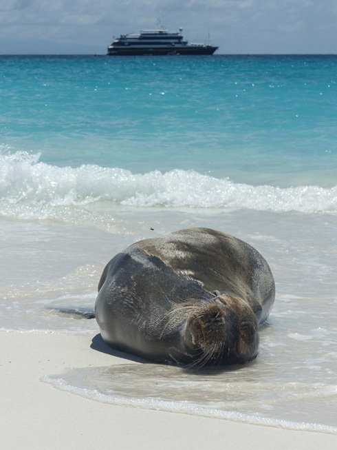 In just a couple weeks, I can feel a change in the climate. Instead of flat calm seas at daybreak here in the protected Gardner Bay, there were light waves dancing around the ship. Although it is still hot and humid, it is more comfortable than it has been these past few months. The waved albatross have returned from their peregrinations around the Pacific Ocean over the last three months, and are now residing on their preferred island for the breeding season. Snorkeling was outstanding today, with young sea lions cavorting with the guests on the white sandy beach, and in the turquoise water. A warm afternoon breeze helped to reduce the mosquitoes of Punta Suarez.