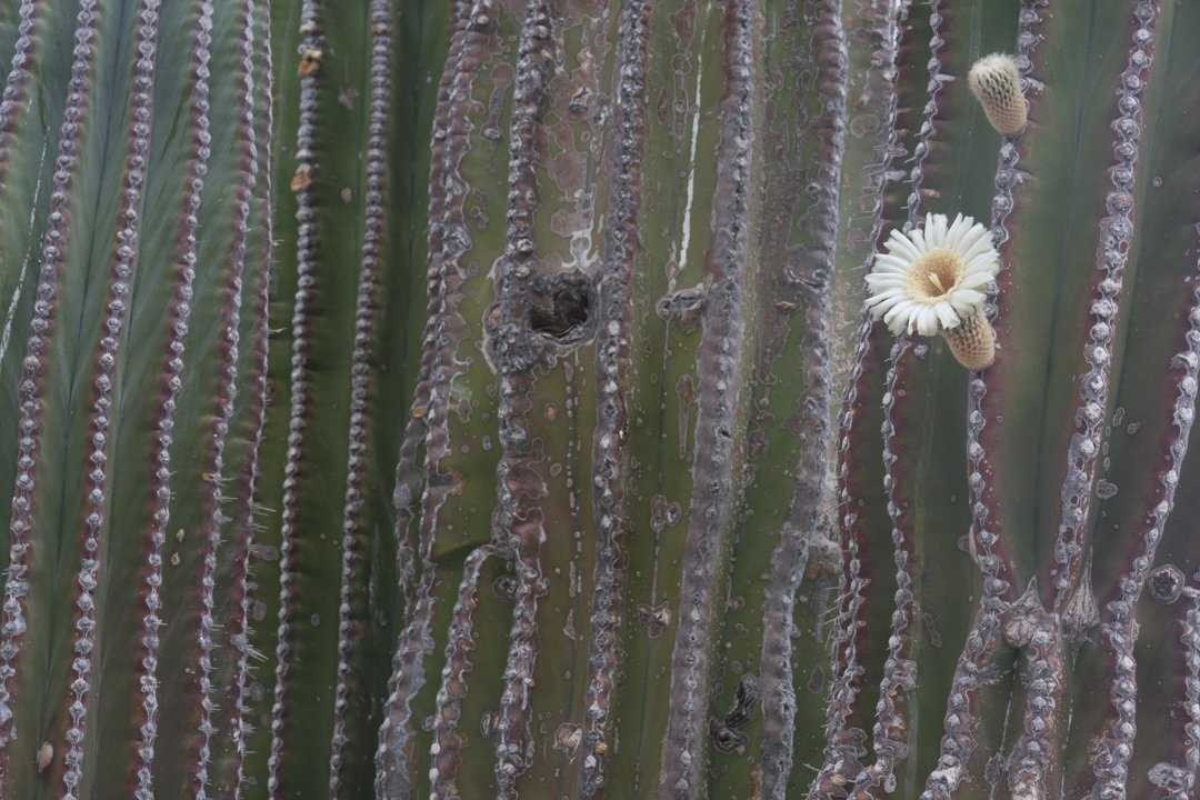 Our walk took on a decidedly scatological tone as we found a packrat nest and discussed 50,000-year-old rat pee, viewed twice-digested jackrabbit droppings and saw how birds, when completing the digestive process, ‘plant’ sticky mistletoe seeds in treetops. We saw cardón flowers waiting for an obliging bat and palo adan flowers ready for visiting hummingbirds. After wandering off to find a particularly verdant mesquite tree we found a terracotta-colored rattlesnake, ensconced in leafy debris in a neat and cozy coil. Meanwhile snorkelers found healthy coral and lots of different colorful fish.
