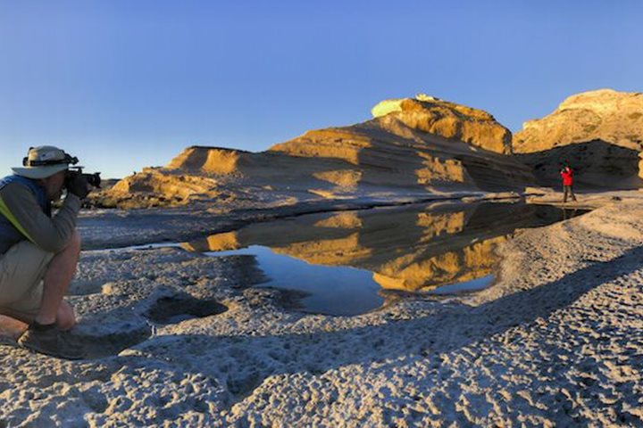 In true expedition photography style, we were up an hour before the dawn and landed on the shore at Punta Colorado on Isla San Jose for a sunrise shoot. The warm light reflecting off the blue water on the red cliffs was a photographer’s dream. The sun cast beautiful shadows on the fossilized bones and shells imbedded in the red sedimentary rocks. After a quick breakfast back on the ship, we returned to the shore for energetic walks in the colorful arroyo and atop the beautiful red cliffs with stunning views of the Gulf of California. In even more true expedition travel, our plans changed by the hour as we encounter great pods of whales. First about a dozen sperm whales that logged on the surface right next to our ship between long deep dives. Then a pod of a few dozen short-finned pilot whales came close to investigate the ship which allowed for incredible photo opportunities. Just when we thought it was safe to venture south, we happened upon a sea of mobula rays jumping out of the water and a humpback whale that breached a few times as the sun set on this very special day. Southward tomorrow for more adventures.