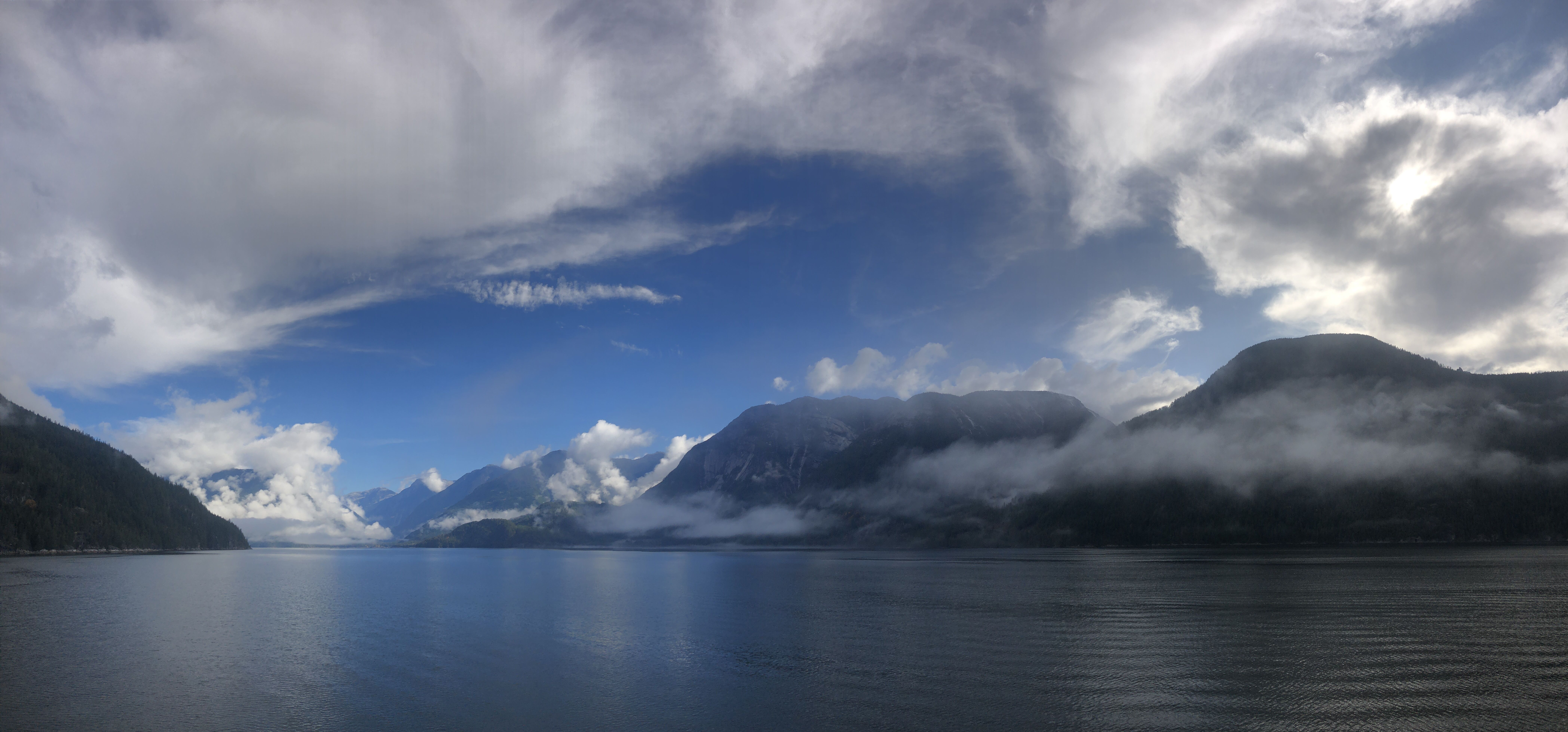 The day dawned cloudy and cool as we plied the waters of Jervis Inlet. By the time we reached the Princess Royal Reach, some 35 miles from the Strait of Georgia, not only had the ceiling lifted, but it was affording us views of several small groups of humpback whales as they were lunge-feeding along the northern shore! We hung with the humpbacks long enough to see them disappear to the west, as we once again resumed our way towards the fabled Chatterbox Falls. Not only did the mists rise, but the sun began to peek out as we rounded the corner into The Queen’s Reach, revealing gorgeous green hills gilded with golden patches along their flanks. Douglas maples signaled the approach of winter.