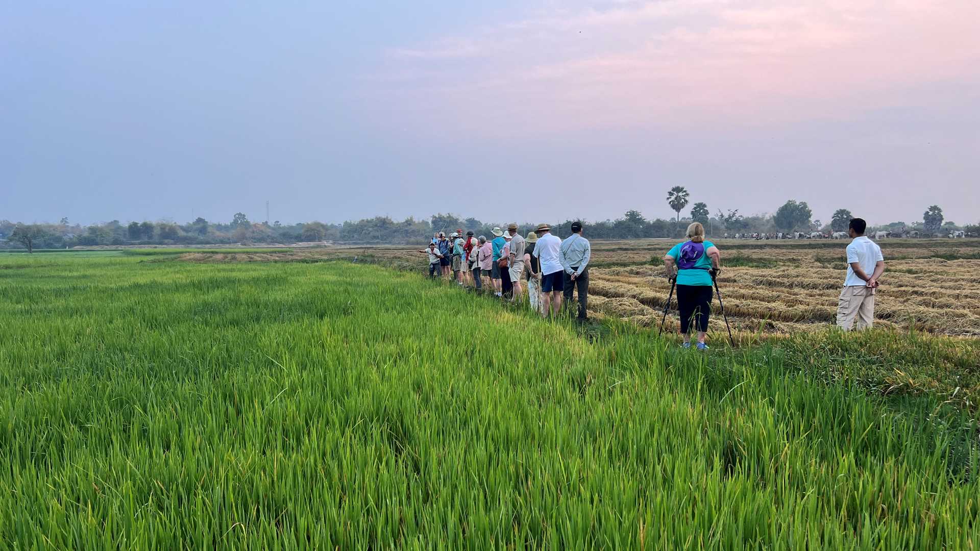 Before dawn, guests scrambled up the bank of the Tonle Sap River and climbed aboard oxcarts to enjoy a local tour across the rice fields, lotus fields, and brick kilns, the tour ending at a local school that teaches children English, computer skills, and environmental ethics. The Green School was founded by a Lindblad Expeditions expedition leader in 2016 and now teaches over 450 students! The energy there was remarkable. Students sang and played interactive games with guests, practicing their rapidly developing language skills.