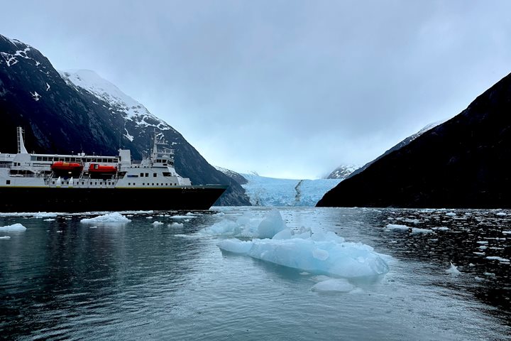 Although offshore waters were windy, we found nice protection in Garibaldi Fjord, a long and beautiful glacial cut into the Cordillera Darwin. The towering cliffs were lined with waterfalls, and southern sea lions were hauled out on shore. We took to the Zodiacs and spent the morning weaving through brash ice and watching imperial cormorants prepare their nests. The Garibaldi Glacier did not disappoint! The cloudy and drizzly day enriched the deep blues of the glacier itself. Small calvings (bits of falling ice) kept our interest during our visit. Then, just as we needed to move on, the glacier showed signs of a larger spectacle, and BOOM! Towers of ice the size of buildings came crashing down at once, much to the delight of all. Finally, our Naturalists Shel, Isai, and Ezra enlightened us with tales of Patagonia.