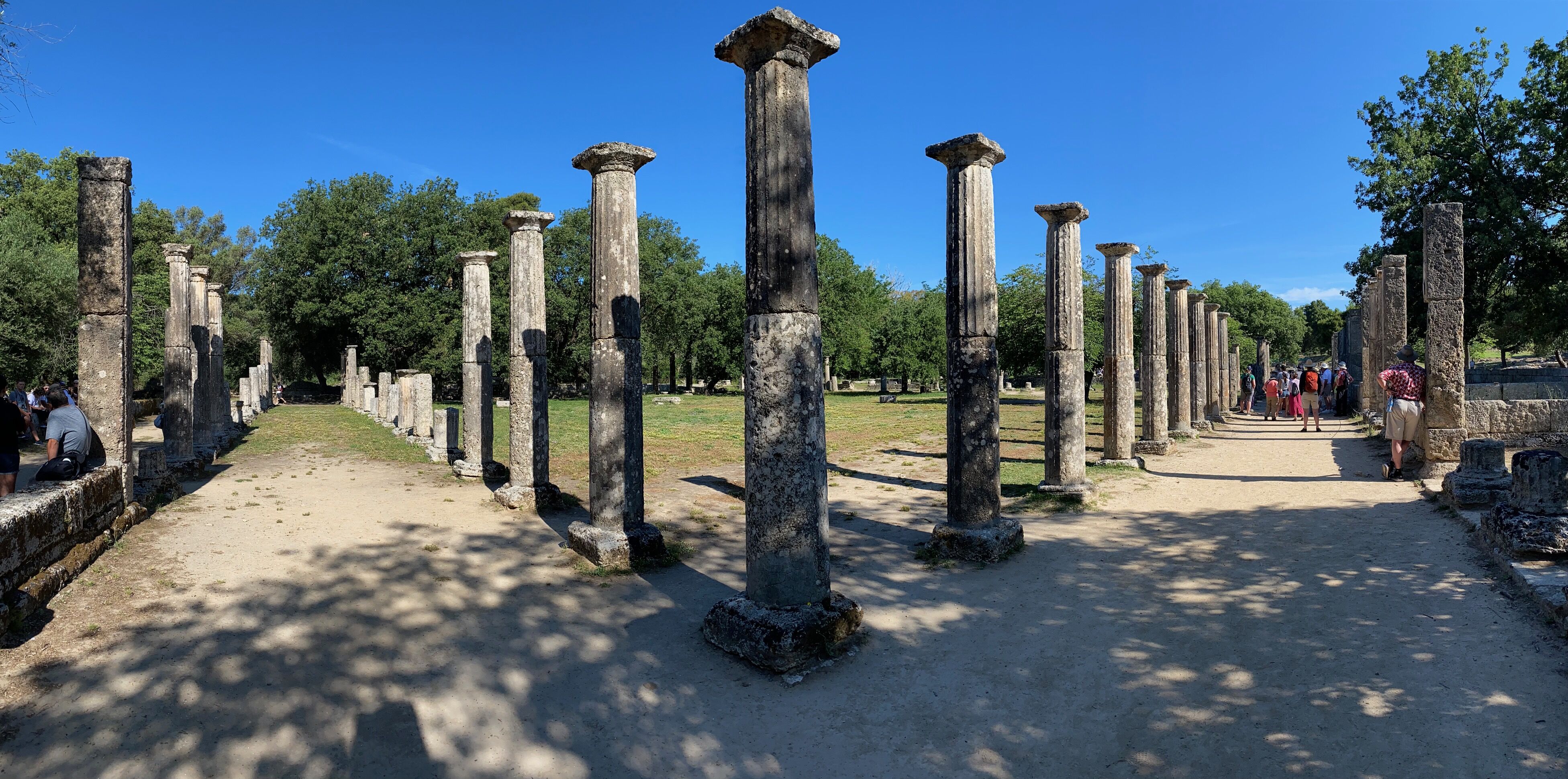 Sea Cloud arrived this morning at Katakolon, a small port town of the western Peloponnese. Fortunately, ours was the only ship at the pier, and this boded well for our upcoming visit to the archaeological site and museum of ancient Olympia. After breakfast, we boarded coaches for the thirty-minute drive inland through the green and lush early summer landscape to arrive at the site of the original Olympics. Guides Gemma and Effie first took us to the archaeological site and explained the histories of the games and of the religious sanctuary. We made our way through the Palestra and entered the sanctuary area, viewing the remains of the Philippeion, the Temples of Hera and Zeus, the Nymphaeum, and the treasuries. We continued into the ancient stadium where many of our guests posed for pictures at the starting line of the Olympic races. Some guests even participated in an actual footrace down the length of the stadium in the glorious Olympic sunshine and heat of the midmorning.