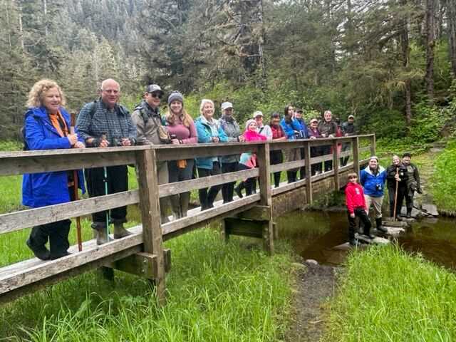 We gained some elevation during our hike to the lake and stopped to drink in the views. It was low tide, so we were able to appreciate how the river meanders. In about another month or so, sockeye salmon will make their way up this waterway for the last time. This area is an important spawning ground for sockeyes. There was once a small fishing village where the Angoon Brown Bear Clan fished, hunted, and gathered food from the temperate rainforest.