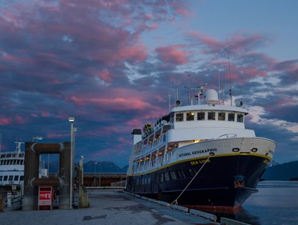 With the tide dropping lower by the minute and depths getting shallower and shallower, we were able to reach outer reefs often just a little too deep for us to explore. While guests were ashore watching a brown bear graze through the growing intertidal zone, Purser Shawn and I donned dry suits and powered up cameras for a dive into the green waters of Peril Strait. Visibility has been steadily increasing as the days go by and we are happy to see numerous jellies pulsing to and fro, a sure sign of clear water ahead. Using a depth sounder, we scanned the bottom for the telltale sign of an offshore reef and there it was, rapidly rising up from over 150 feet to 30 in just a matter of yards. One last safety check and we splashed down, descending into an unknown world of weird creatures and foreign life.
