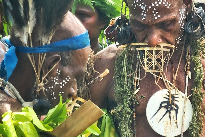 What an amazing way to start the year! We woke up to the sound of rain pattering on the ocean as we cruised toward the beach of Nendo in the Solomon Islands. Piling into our BAT mobiles (Best Available Transport), we headed up the mountain for an hour to reach the remote village of Noipe, rarely visited by outsiders. The locals gave us a warm, vibrant welcome—dancing, singing, and sharing delicious local dishes. They also showed us their traditional crafts, demonstrating skills passed down through generations. This included the creation of tevau, feather money, an extremely rare art and currency still used in the Solomons today. Back on board, the adventure continued as we encountered a small pod of sperm whales, including a mother and calf. As we continued cruising, we made our way to circumnavigate Tinakula Volcano. With a stormy sunset painting the sky, it was a powerful, unforgettable way to end the day. What a first day of the new year—full of new sights, sounds, and experiences we’ll never forget!