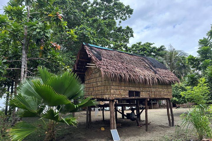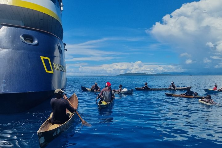We commenced our day with an early morning snorkel on a beautiful island reef. Small groups of guests moved with the gentle current on the edge of the drop-off. The marine life was abundant and diverse. After breakfast, and when the tropical storm passed, we all crossed on a Zodiac from National Geographic Orion to the small village of Utupua where we were greeted by enthusiastic locals. A group of ‘warriors’, young and old, ran at each Zodiac in an exhilarating and light-hearted display. Everyone was thrilled with the show. We were treated to a welcome song and cultural dance, then we presented educational material to the chief and village teacher. An exploration of the village followed where we got to know the people, their lifestyle, and made new friends.