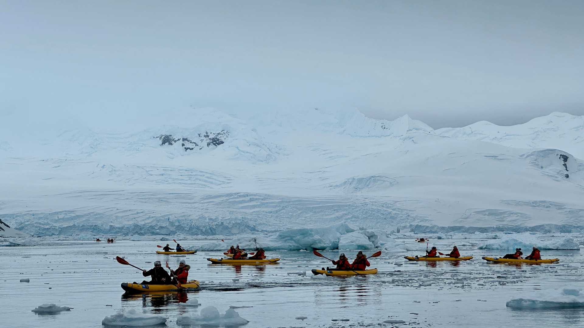 With a calm afternoon, we got to put our kayaks in the water in a very icy and dramatic landscape, then we plunged. A new record for National Geographic Resolution as 97 guests jumped into the zero-degree Celsius water.