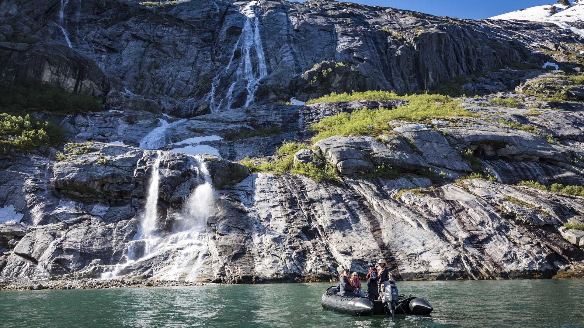 We woke up to an absolutely beautiful day in Nordfjord and chose between a Zodiac cruise or kayaking. On both we saw young harbor seals and an abundance of tall wispy waterfalls created by melting glaciers, cascading hundreds of feet from high on the fjord walls. Upon return to the ship we were greeted by a delicious barbecue lunch on the aft deck. Then Captain Martin Graser decided the deck needed a wash and some of the guests needed a shower so he steered the bow under a giant waterfall in Melfjorden. On the way out of the waterfall we encountered a pilot whale that spent a good bit of time diving under the ship and spraying rainbows with its blow hole. After dinner we visited a cute and very little village called Husøy in the Træna Archipelago to celebrate crossing the Arctic Circle.