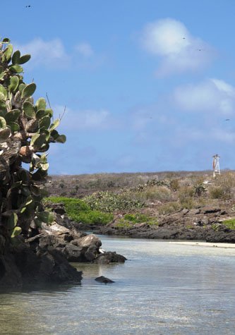Our day starts with a bright sky and an eager energy in the air. North Seymour was once a subaquatic area connected to Santa Cruz Island and through volcanic uplifts it has arrived to where we are landing today. Naturally dry due to its position in the rain-shadow of Santa Cruz, North Seymour does not appear to be lively, however we find an abundance of life as we explore inland. Land iguanas lumber about as they search for their daily nutrition among the prickly pear cacti. As we head inland after landing we notice that this island is quite alive. Magnificent and great frigate birds use this island as a nesting area and we come upon various chicks in different sizes as they sit upon the nests awaiting their parents’ return so they may obtain nutrition. Grey incense trees surround the path as we make our way inland. An occasional croton tree and palo verde trees add color to the surroundings as we balance ourselves over the boulder terrain. It is hard to believe that life can sustain itself in this arid environment, however we continue to find the lively struggle for existence. As we return to the coastal area a few blue-footed boobies display in the distance, trying to find mates as male frigate birds and their inflated gular sacs try to obtain theirs. Along the coast, Galapagos sea lions are present with many young pups playing in the intertidal zone awaiting their mothers’ to return from foraging so they may feed. As we walk among skeletal remains we are reminded of this continual struggle for life.