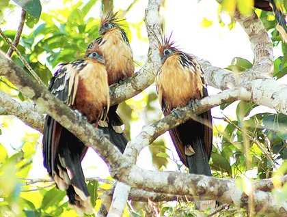 In this area we observed many bird species like egrets, hawks, cormorants, parrots, and storks. The icing-on-the-cake was the sighting of the eminently curious and prehistoric-looking Hoatzin (Ophistocomus hoazin). This beautiful bird species is one of the most representative of the Neotropics. Its natural history occupies important sections in nature books. Just some quick facts, young hoatzins have claws to return to their nesting sites after diving into the water escaping from predators. Hoatzins are vegetarian, feeding on leaves that digest with their highly efficient and compound digestive system. In addition to the many animal species we saw we had the excitement to have our breakfast outdoors aboard the skiffs! We had our first meal of the day served in the rain forest with white gloves on the hands of or naturalists and fabric napkins included. On the way back we spotted a large spectacled caiman warming up on a riverbank. The reptile allowed us to get very close giving their observers a great photo opportunity.