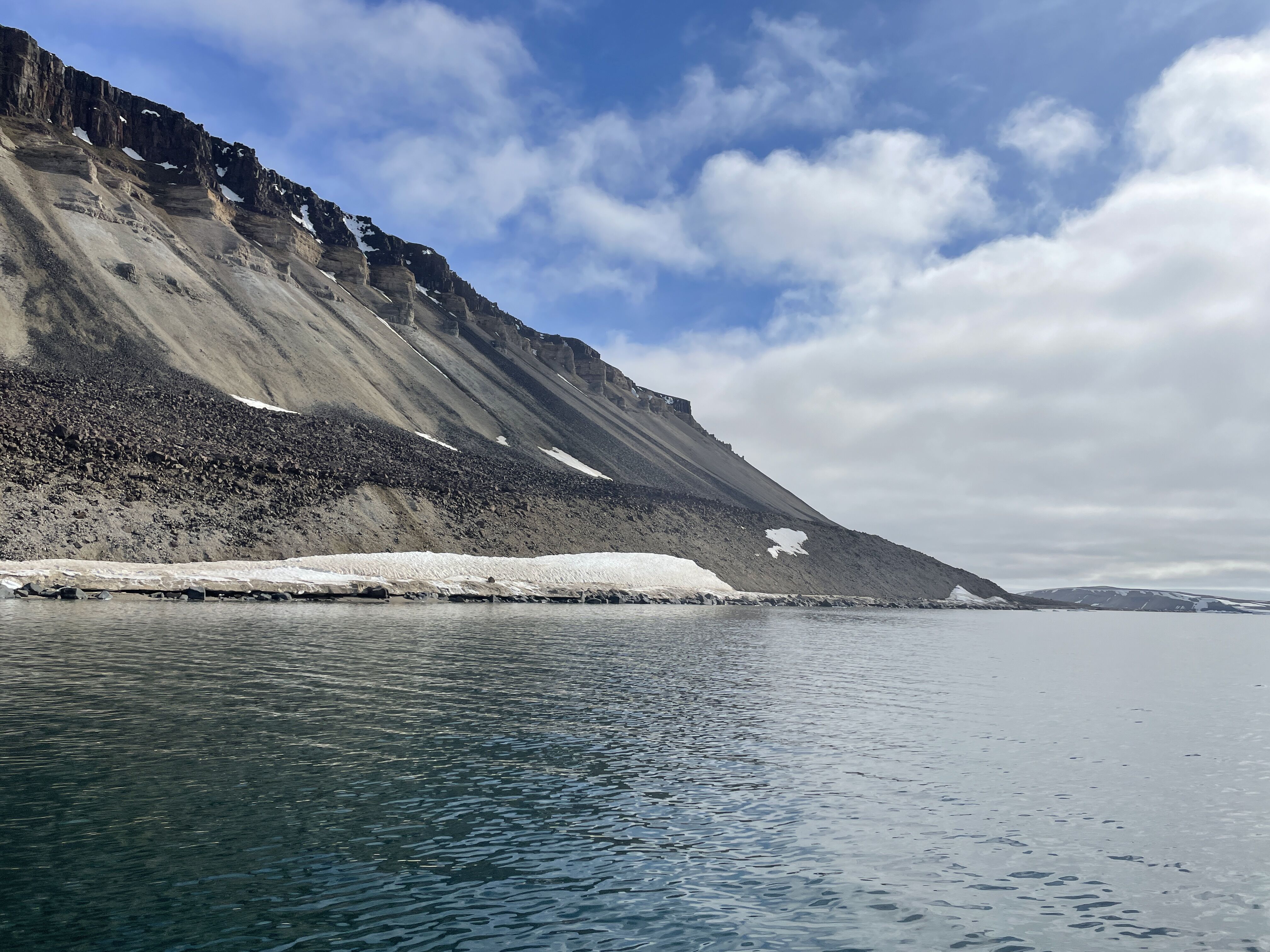 After reaching a maximum latitude of 81.25 degrees North, the farthest north National Geographic Endurance has traveled in her time at sea, we spent the night cruising southward toward Nordaustlandet. In the morning, we were greeted with a drastic change of scenery. Expansive, butte-topped sedimentary mountains gave way to long fjords. Here, bits of sea ice came into view as we made our way to Palanderbukta.