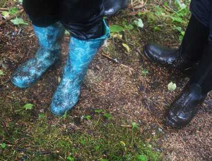 Many went ashore for a walk. Meandering along the shore, the trail plunges into the forest, then re-emerges along a broad stream bed. Here salmon migrate in the late summer and bears use this spot as a fishing ground. Many ascended a small bluff beside a waterfall and then walked further in the forest. Here, they encountered some number-one, class-A, boot-sucking mud, without which any Alaskan experience would be but a pathetic hollow shell. Eventually walkers passed a beaver lodge before getting a quick view of the pond above the falls.