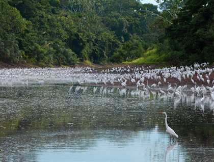 Wildlife was just as good in the late afternoon. We walked the trail that follows the stream flowing from Lake Eva. This is a good salmon stream. Winding through the woods, around a meadow and up to a set of cascades, we were delighted to find a fishing bear. The good-sized bruin was swimming upstream, pausing regularly to chow down another fish. We watched for quite a while until the bear tromped off into the woods. Then we found another fishing creature! Paul, our undersea specialist, donned his dry suit and did his best bear imitation. At Recap, his underwater-video bearspective shed light on how skillful any animal must be to snatch a meal from this stream. Elsewhere along the trail we saw summer’s culmination in all sorts of rank and extravagant growth, as if vegetation were competing with salmon in morbid fecundity. We found vivid bunchberries, weird blue lily capsules, and huge skunk-cabbage leaves grown out of proportion to near-collapse.