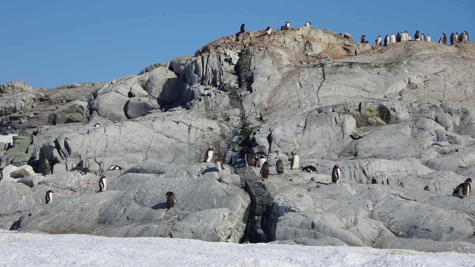 During the night and into the morning, National Geographic Explorer moved north towards Petermann Island. In the morning, geologist Serguei Ponomarenko presented, “Ice on Planet Earth” focusing on the interpretation of glaciers and icebergs observed during this trip. In the afternoon we landed on Petermann Island, home to rookeries of Adelie and gentoo penguins. The weather was spectacular – sunny, no wind, and visibility for miles around. Penguin chicks were grown and molting, changing their baby down into adult, waterproof feathers.