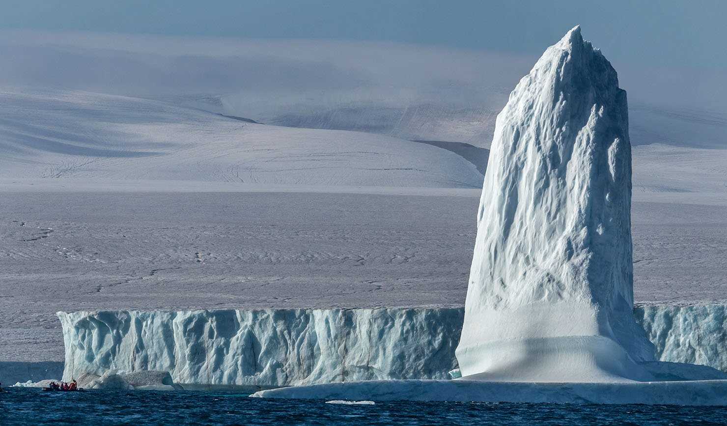 As so often happens the best laid plans are sure to change. A bear on land means we cling to the sea. For an instant a change in plans can produce anxiety but in most cases the alternative proves to be so much better. Our gorgeous glacier had spawned a sculpture garden and in our trusty Zodiacs we circled and examined one after the other. Of course there is often one berg that outshines the rest. A pure white towering pinnacle reaching towards the still visible moon took the prize today. But there were more. Fluted blue edges, arches and fingers, bergy bits crackling like breakfast cereal could fancifully be thought of as exhibiting the mood of water.