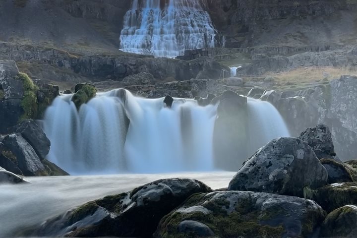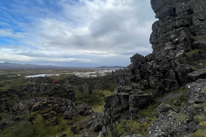 This morning, we woke up in a foggy Romer Fjord. It was a typical fall morning for Eastern Greenland; however, we have been very lucky with sunny and calm weather on almost all our previous days, which is quite unusual for this time of the year. A gloomy vertical cliff exposing layer after layer of flood basalts was on one side of the fjord, and the top of this cliff was hidden in the low clouds. Another side of the fjord was covered with piles of rocks left by an Ice Age glacier. One small hill on that side of the fjord was quite distinctive in color, greener and greyer than the rest of the landscape, which was predominantly brown. As we learned later, a thermal hot spring was running from the top of that hill. A little distance below the top, the spring water accumulated in a pool. Three activities were offered in the morning, including a long hike, a free, ambient walk within a large perimeter, and for the most adventurous guests, bathing in the thermal pool.