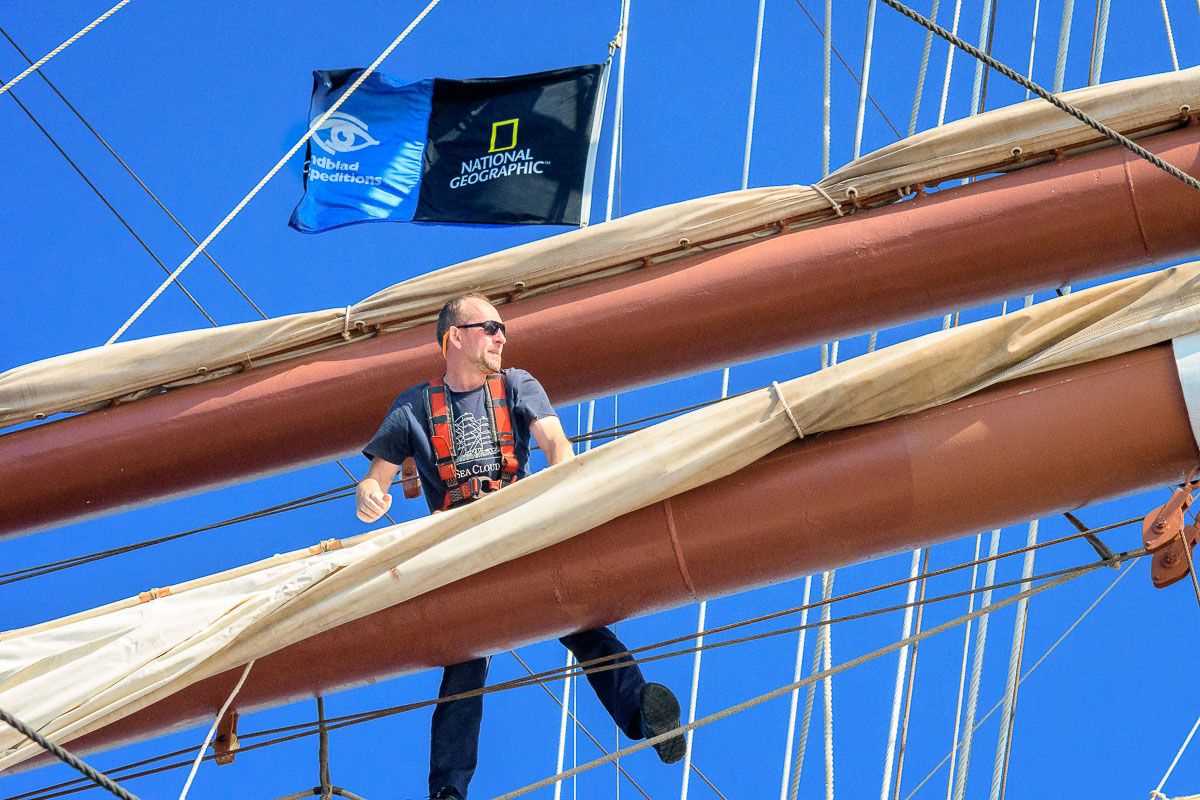 The 15-knot moderate breeze from the north couldn’t have been better for our first day aboard the Sea Cloud, and we were soon dizzy from gazing up at the rigging of this true, hand-sailed four-mast barque. The wind increased through the afternoon and we averaged over six knots, sailing through the passage between the islands of Ios and Sikinos before we anchored south of Santorini for a refreshing swim before dinner.