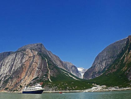 We were all hoping for a late-afternoon swim after the sailing, and our expedition leader had planned for us to anchor at the south end of the dramatic uninhabited island of Poliegos (poly = many, iagos = goats). The red mineral cliffs were stunning, but alas the increasing winds were wrapping all the way around the island, and if we had anchored the ship the winds would have wrapped us right into the cliffs. Captain Komakin held the ship off for some excellent photographic opportunities before we backed away to anchor in the open winds. The ship was remarkably stable in the strong seas, as we enjoyed a superb gourmet meal for our welcome dinner and retired for the evening in anticipation of tomorrow’s visit to the sacred center of the Cycladic Universe at the island of Delos.