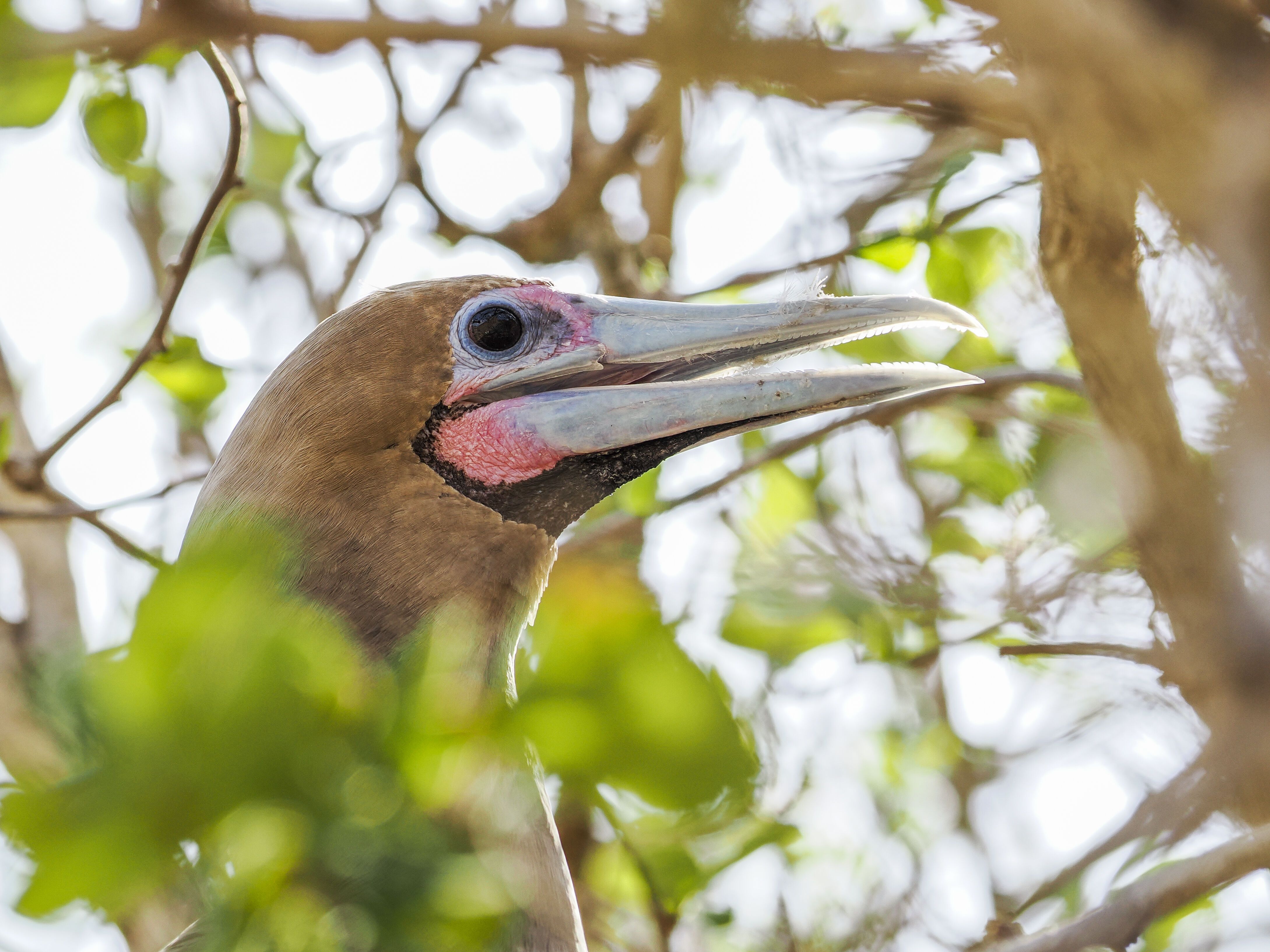 On the last full day of our expedition, we visited San Cristobal, one of the archipelago’s oldest islands. We started the morning with a hike to the top of an eroded tuff cone. A system of mountains created by compacted volcanic ash makes up the area. Disembarkation took place on a greenish sand beach that contains particles of olivine, a crystalized form of silica that shines green. We walked in groups through eroded cracks on the mountainsides to look for red-footed boobies. This is one of the only visitor sites in the Galapagos where red-footed boobies, blue-footed boobies, and Nazca boobies can be seen together.