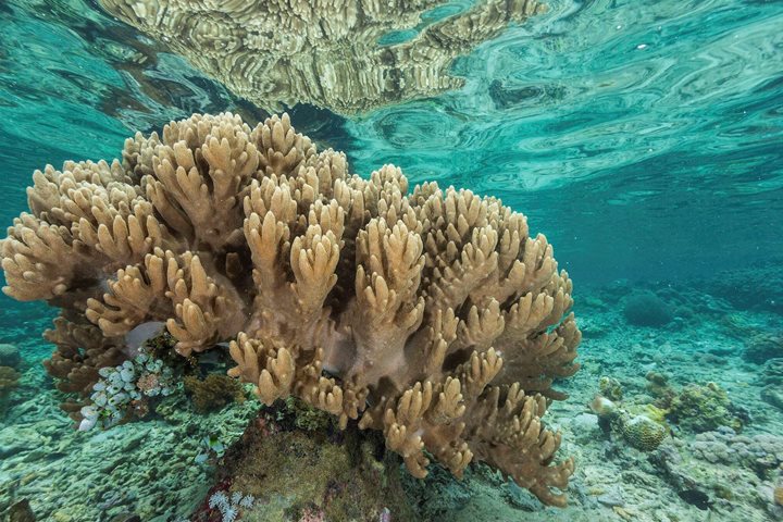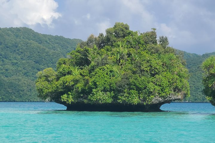 We woke up this morning as National Geographic Resolution made its way around strange mushroom-shaped limestone rocks sticking up out of the sea, with a drapery of vegetation covering each one. In the morning, we all got in power boats for a beautiful ride between the dark green rock islands and light blue reefs. We docked in a bay and walked over a ridge to the amazing jellyfish lake. This saltwater lake was created by a limestone sinkhole, then filled by seawater seeping in through the limestone cracks. Dozens of bird species flew over the green lake and vegetated cliffs. We went snorkeling in the warm lake to see the thousands of clear moon jellyfish everywhere we looked. However, the brightly colored golden jellyfish stole the show, with their long tentacles colored orange by the algae that live in them. What a lifetime memory! Next, we stopped and pulled the boats up on a sandy beach to have a bento box lunch in the shade of pine trees. Some guests walked along the beach, while others snorkeled off the beach. After lunch, we rode in the speed boats to another bay, where we slipped into the water to enjoy the psychedelic colors of thousands of huge brain corals. We enjoyed a leisurely float around the corals, fish, tunicates, and other brightly colored creatures. The clams growing here were a brilliant dayglow blue color. All around us were high limestone cliffs covered with tropical vegetation. Our last planned stop was a silty green bay, where we went swimming. Most of the guests smeared the fine white mud from the bay all over their bodies, creating a comical situation. Then, they jumped into the water to enjoy a swim without goggles or flippers. Several guests examined the strange cave-like indents at the base of the mushroom-shaped rock islands, and we learned that these six-foot overhangs were eroded by animals! It turns out that invertebrates (chitons and clams) erode the intertidal zone rocks about one inch every decade. On the way back to the ship, we suddenly saw huge manta rays swimming at the surface. So we stopped the boats, put on our snorkel gear, and jumped in the water to see these magnificent creatures up close. As they swam under us, we could see their white jaws and gray bodies, seven feet across. What a fantastic way to end such a memorable day in Palau! Photographers : Joe Holliday, Naturalist, and LaBelle Edmiston, Guest