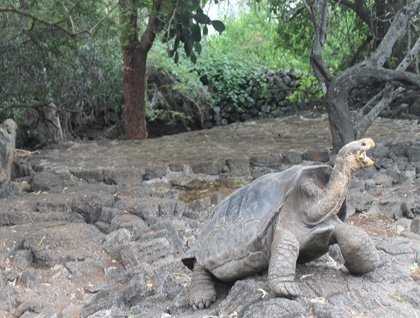 Lunch was in the highlands, at Aquelarre Restaurant, a quiet place with a great garden and delicious food. The habitat in the highlands is perfect for land birds, such as the Darwin finches, and also hosts a diversity of plants, as well as the giant tortoises. Big males were seen around the area—it is an amazing experience to walk among these giants!