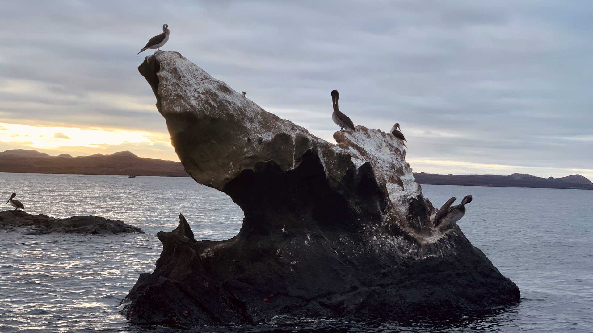 Sombrero Chino features a landscape dominated by volcanic formations, including lava tubes, cones, and spatter. The islet's volcanic origin is evident in its rugged terrain with black and red volcanic rocks scattered across the sandy shores. The coastal waters are rich in marine life, including species like sea lions, marine iguanas, and Galápagos penguins. These animals thrive in the nutrient-rich currents surrounding the islet.