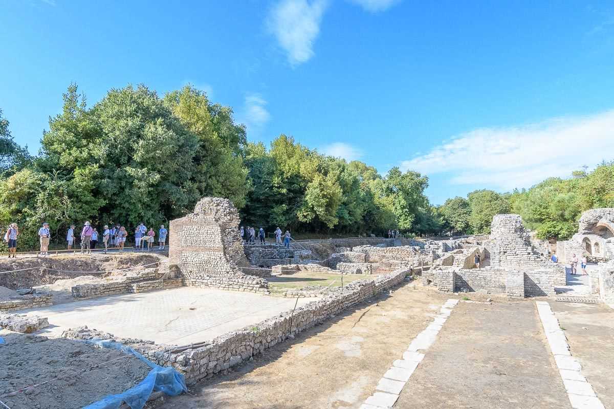 Today we awoke in Sarande, a pretty city full of beaches and purple flowers along Albania’s southern coast. We boarded our buses early to get to the archeological ruins of Butrint before the crowds. We were lucky enough to have the UNESCO World Heritage Site almost completely to ourselves as we surveyed the evidence of 2,500 years of continuous occupation here. These ruins have been used by several different civilizations and have many different layers left behind from Hellenic, Roman, Byzantine, and Venetian people. We walked through the impressive Greek amphitheater which at one time could accommodate 2,500 spectators and had incredibly advanced acoustics for the time. Next we were fortunate to see the elaborate and colorful mosaics of the Byzantine baptistery floors, which we were told are usually covered with sand for protection. Towards the end of our visit we climbed to the top of the Venetian fortress and looked out upon the Albanian countryside and looked down upon one of the famous Ali Pasha’s many castles.