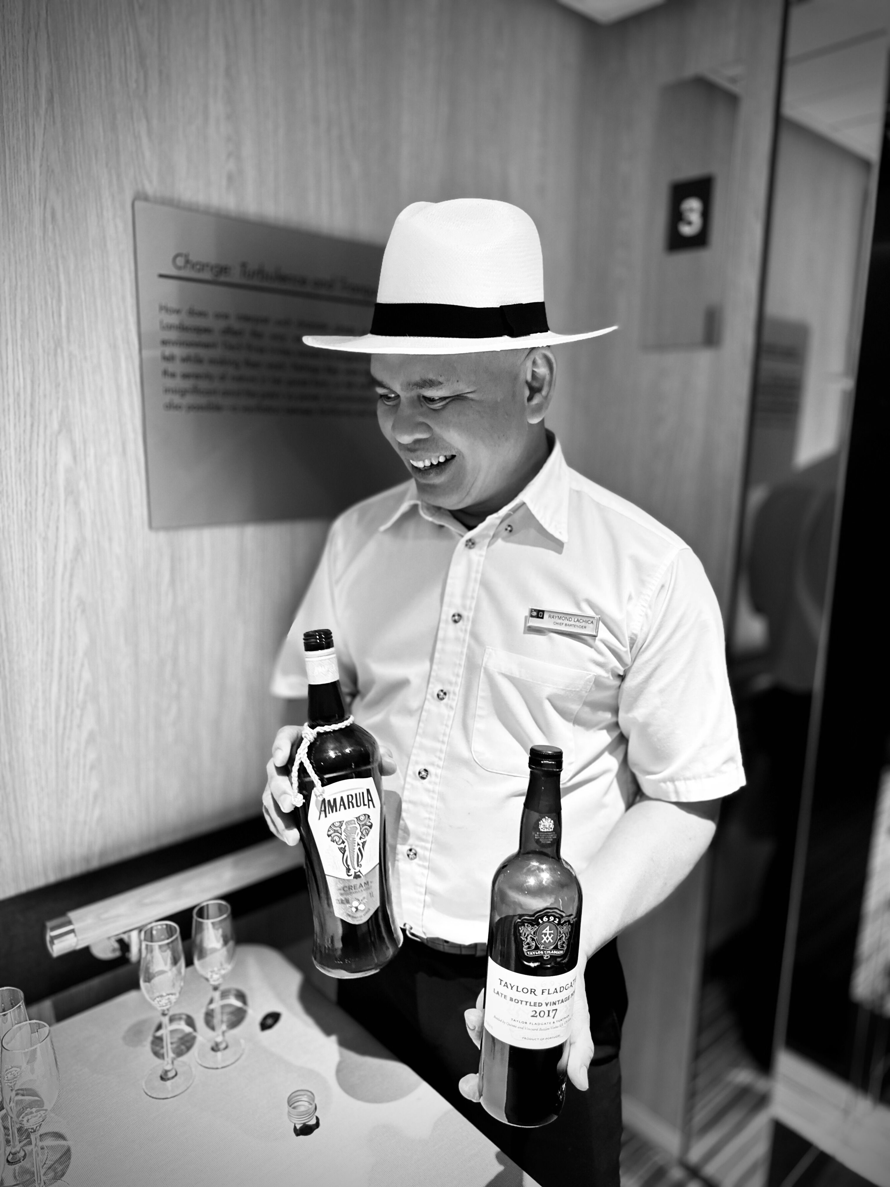 After another fine lunch, there was a scheduled nap. On the way to my cabin, I found a handful of guests who were rebelling against this beloved activity. (This is just my opinion, which isn’t necessarily endorsed by National Geographic/Lindblad.) Approximately ten passengers explored the artwork around the ship.