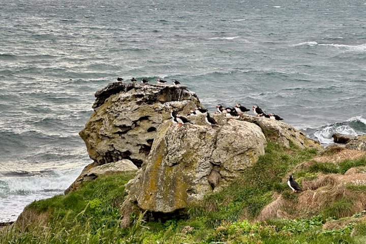 During dinner, the ship left the fjord and entered a dense field of floating sea ice and icebergs. From the windows, guests observed hundreds of hooded seals on ice in the foggy air.