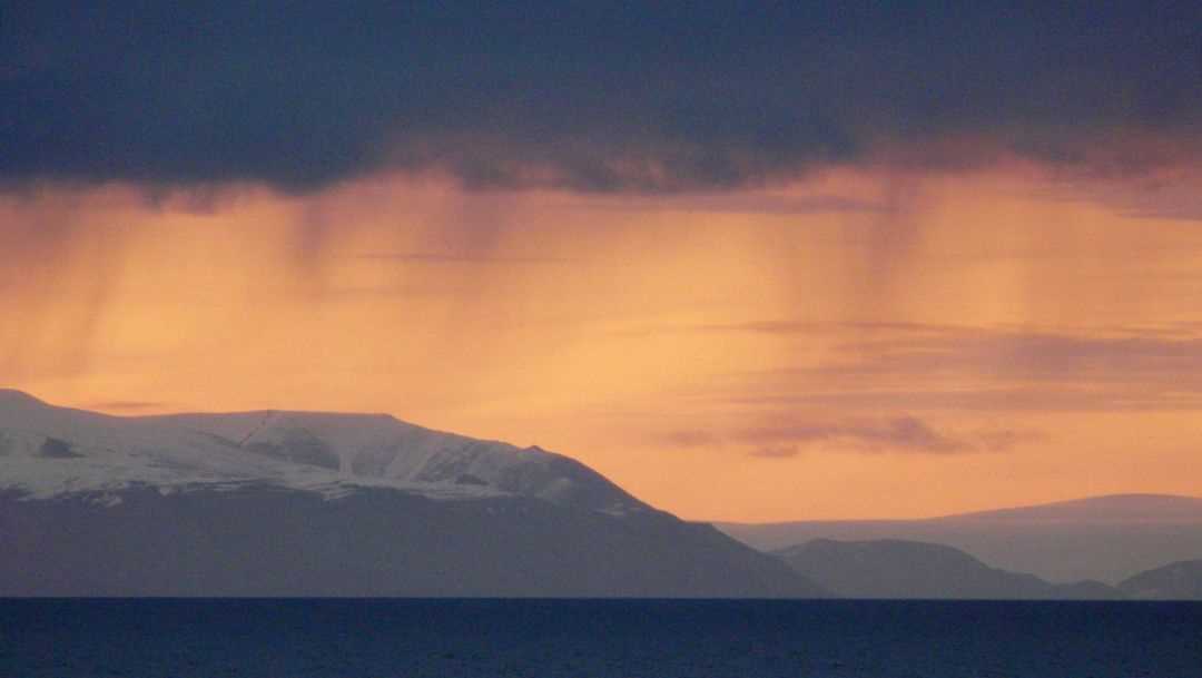 Here in the Far North the sun seems to take a leisurely approach to mornings. More than an hour before its brilliance illuminates the sea, pastel peaches and baby blues appear stretching behind dark silhouetted landforms. Gradually the colors intensify. Soon dark blue virga fell from a navy sky as repetitive highlights contrasted with a deepening orange.