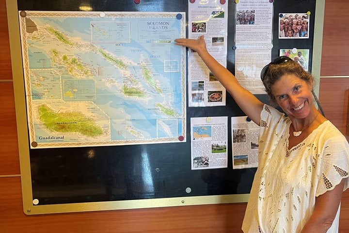 After epic adventures over the top of wild northern New Guinea, National Geographic Orion arrived at the Solomon Islands. After clearing immigration, we went to nearby Kennedy Island where we learned of John F. Kennedy’s heroic swimming efforts after his PT-109 boat sank during World War II. Snorkeling from the beach, the detritus of war covered the sea floor in the form of ship masts and other ship parts. The snorkeling was exceptional and the water super clear. We were immediately greeted by a school of crocodile needlefish and then found some pipefish (a seahorse relative) and the most amazing fish of them all, the crocodile fish. Incredibly well camouflaged by its large, flat, and elongated head, it looks just like a crocodile and its fins look like feet! Wow!