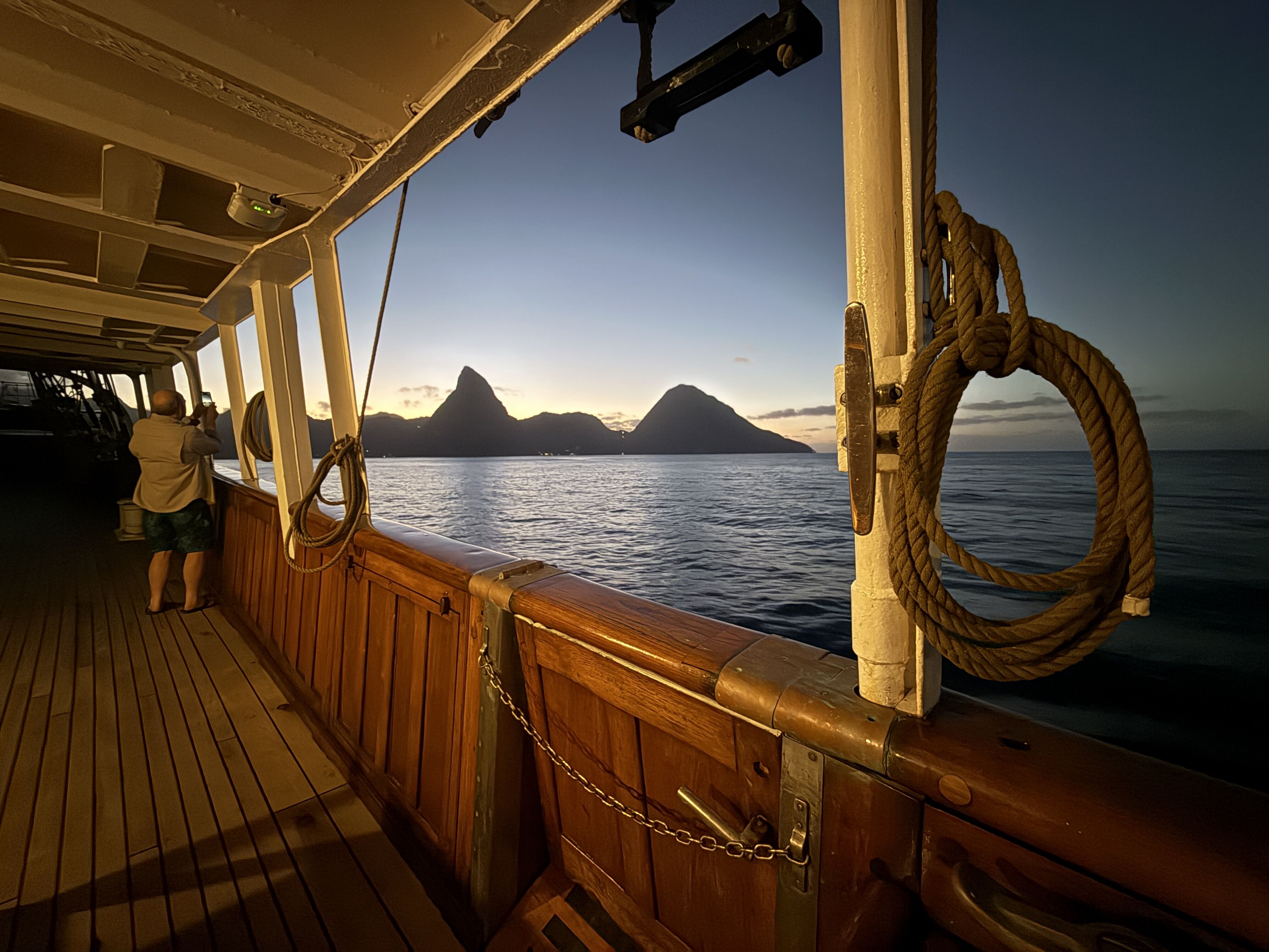 The small city of Soufriere, on the beautiful isle of Saint Lucia, sits at the edge of a massive volcanic caldera. The name of the city means "Sulfur in the Air," as the smell of sulfur dioxide is pungent. We drove to a great overlook adjacent to the UNESCO Pitons, which are two massive volcanic plugs rising to almost 2500 feet above the sea. Along the way we stopped at a small shop which sold the world's most unique catsup, made essentially from bananas and pure cacao. We then visited Diamond Falls Botanical Garden, which hosts a cornucopia of every variety of tropical plants, including ginger, lilies, anthurium, vanilla, cocoa, and cashew. It is said that the Empress Josephine visited the gardens when she stayed at her father’s estate “Mal Maison.” We then went to Butterfly Beach for a great snorkeling adventure. Guests saw octopus, parrot fish, purple wrasse, and fan and brain coral. Tonight, photo instructor Rich Reid ran the slide show of all the photos the guests submitted – a great souvenir of our unforgettable voyage. We completed this great adventure with the fantastic Captain’s Farewell dinner.