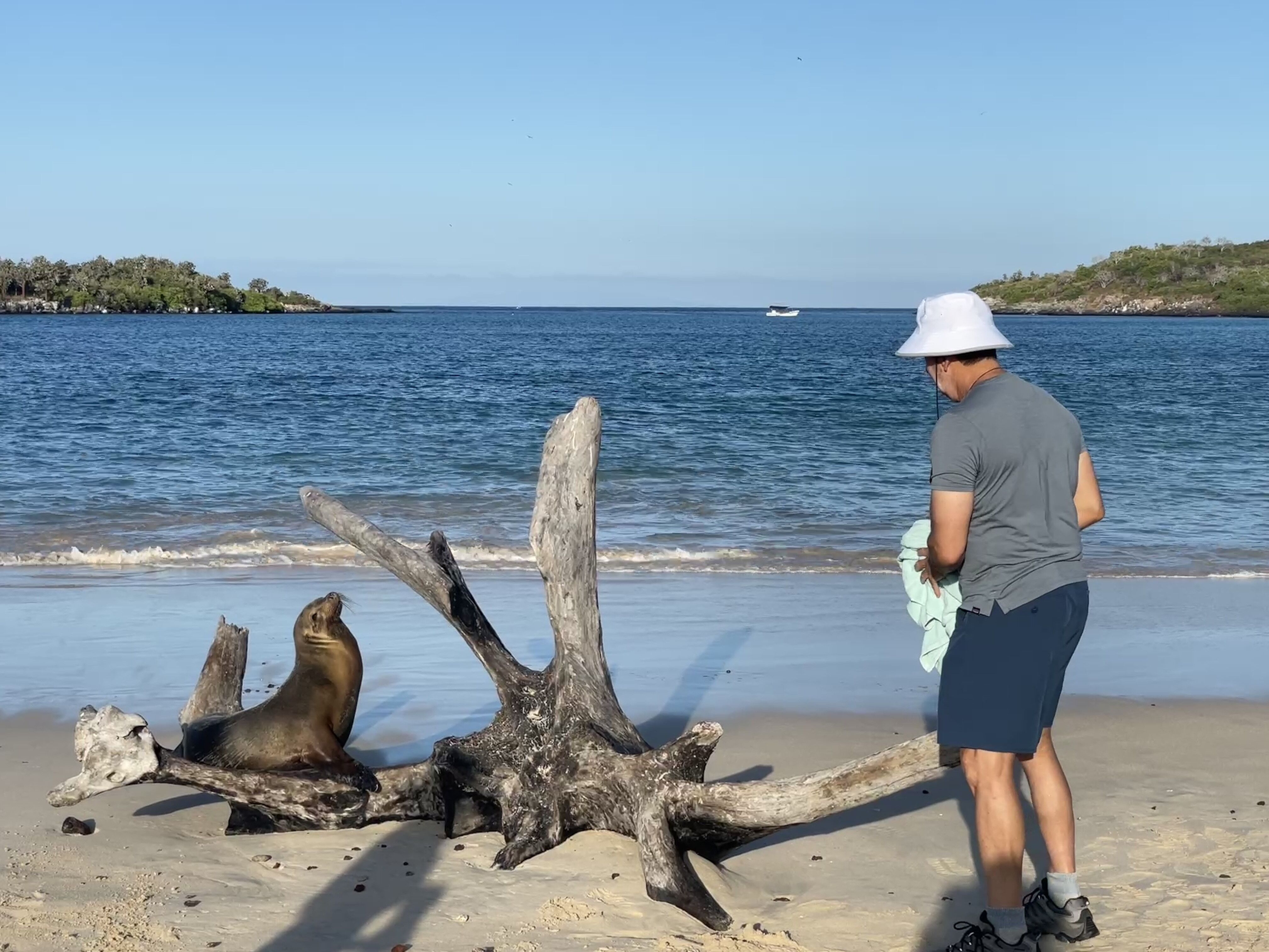 We navigated to Santa Fe Island in the afternoon and enjoyed a snorkeling excursion. Curious sea lions played with each other, and multiple Pacific green sea turtles swam by serenely. Much to our amazement, a school of eleven spotted eagle rays glided by in formation! We went ashore in the late afternoon to explore Santa Fe’s unique landscape and giant opuntia cactus forest. What a wonderful end to our day!