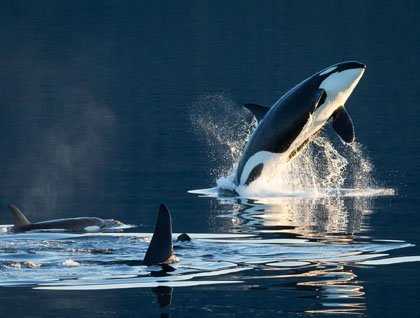 We eventually returned to the warmth of our ship, and turned to make our way back along the winding course of the fjord. We paused again near the mouth of the fjord, this time awaiting a float plane from Juneau that delivered our final two guests who were arriving a bit late to the ship, but in grand style. The sun continued to glance off of the snow-draped peaks, casting magical reflections across the waters as we left the fjord, returning into Stephens Passage. After dinner, Dall's porpoises came to ride along on the ship's bow wave. Shortly after they departed, the call came out that a group of killer whales had been sighted ahead of the ship. We drew closer and slowed to watch them. It was a large group of resident-type whales named AG-Pod by researchers, which have been known from the waters of Southeast Alaska and also Prince William Sound for several decades. As the sun was dipping low over Admiralty Island, the killer whales cavorted as if with glee; lob-tailing, spy-hopping, and breaching many times to cheers from all of us gathered on the ship's decks. As the whales continued surfacing peacefully around us, alpenglow tinted the snowy peaks of the Coast Range as the setting sun painted colorful skies to end our day.