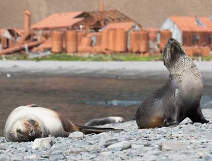Remnants of the bygone industry were still scattered about amongst the myriad of wildlife. Large propellers lay half buried in the sand in the shadow of the decomposing buildings where the whalers processed their catch. Our next stop was to Olsen Bay to enjoy the second waterfall of the day with hundreds of Antarctic Fur Seal pups playing in the fresh water stream. Spinning playfully, they were a stark reminder to just how wild South Georgia can be.
