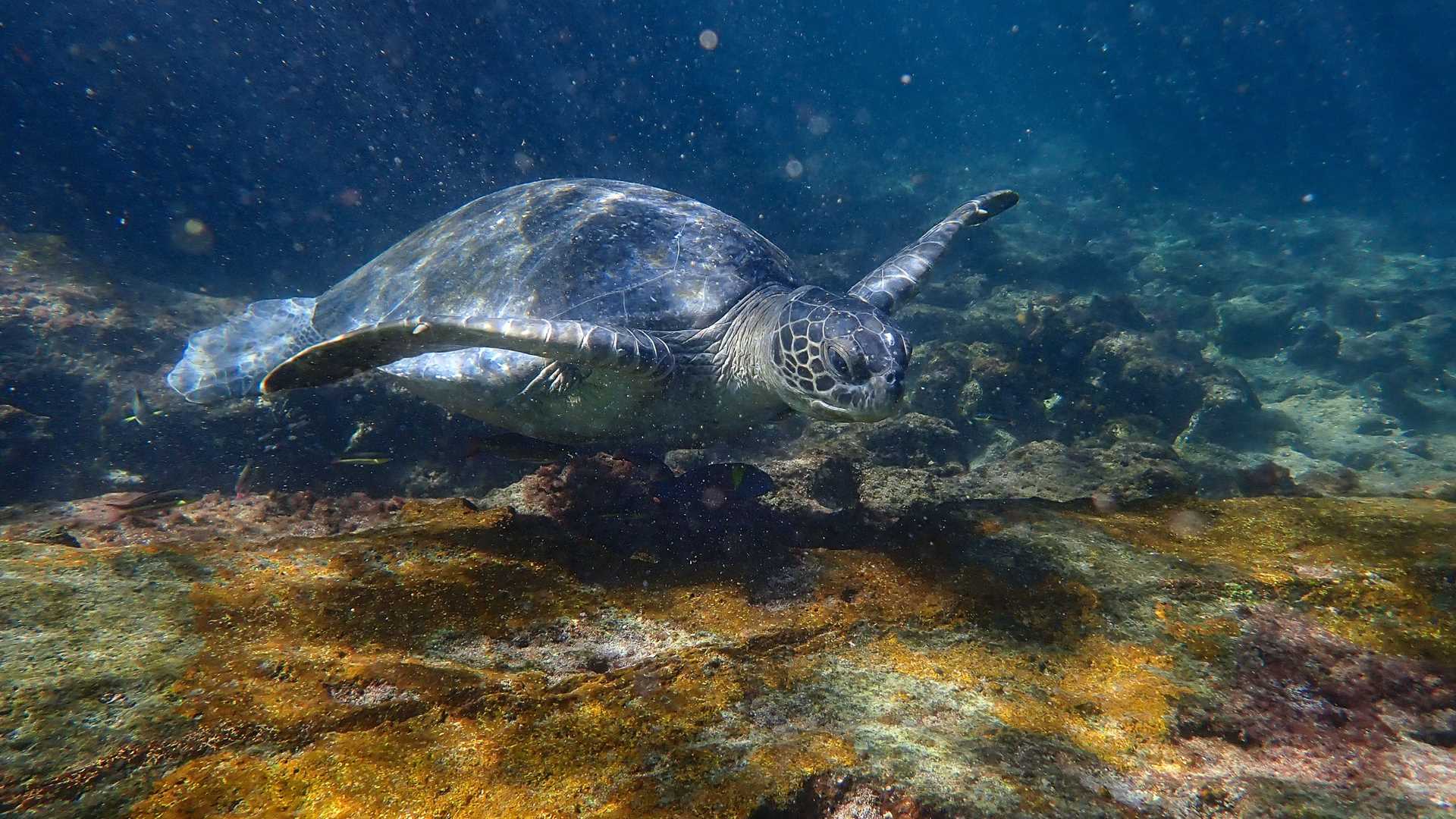 Walks over pa-hoe-hoe until it met red scoria was followed by snorkeling with penguins and other delightful marine creatures. The afternoon reversed the activities, snorkeling with turtles was followed by a hike up to a vista unique to Galapagos – and the sun shone all day.